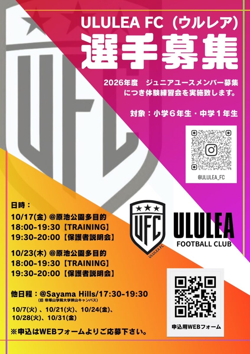 ululea fcでは来年度に向け、以下の学年で選手を募集しております。 •現6年生 25名程度(GK3名程度) •現中学1.2年生 若干名(GK急募) ⚠︎みんなの将来、様々なサッカーのスタ…